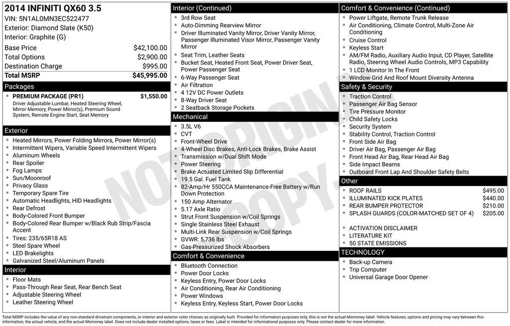 Experience the exceptional craftsmanship, advanced technology, and exceptional versatility of the 2014 INFINITI QX60 Base. This exceptional crossover is ready to elevate your driving experience. Schedule a test drive today and discover why the QX60 is the perfect choice for your next vehicle.