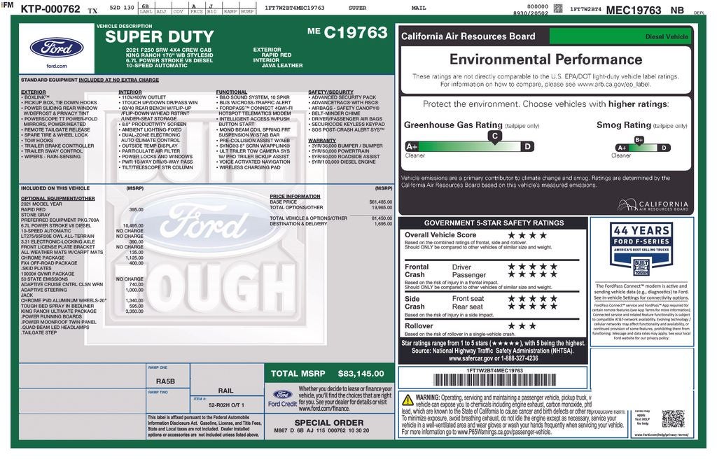 Discover the ultimate in power, capability, and comfort with this exceptional 2021 Ford F-250SD King Ranch. This heavy-duty truck is a true workhorse, engineered to conquer any task with its robust 6.7L Power Stroke V8 Turbodiesel engine and 10-speed automatic transmission. Equipped with four-wheel drive, you'll confidently navigate the toughest terrain, whether it's a construction site, a remote job, or a weekend adventure.