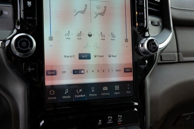 This Laramie trim level comes equipped with an impressive array of advanced features, including a state-of-the-art Uconnect 5 navigation system with a massive 12-inch display, Apple CarPlay, Android Auto, and a powerful 10-speaker audio system. The interior pampers you with luxurious leather-trimmed seats, a heated steering wheel, and dual-zone automatic climate control, ensuring your every drive is a pleasure.